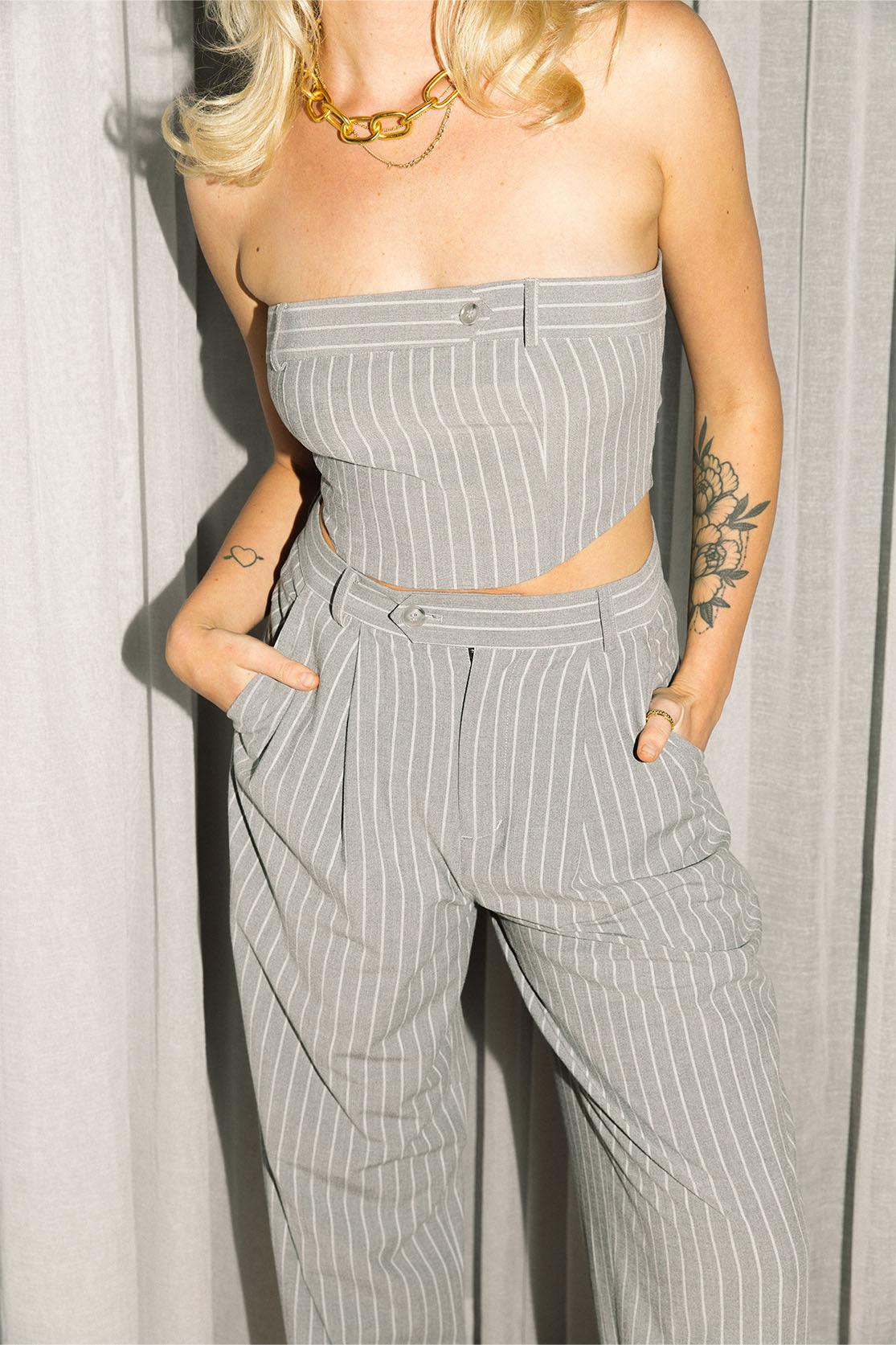 A feminine take on the classic pin-stripe shirt, the Georgia corset is a statement top with endless styling possibilities.