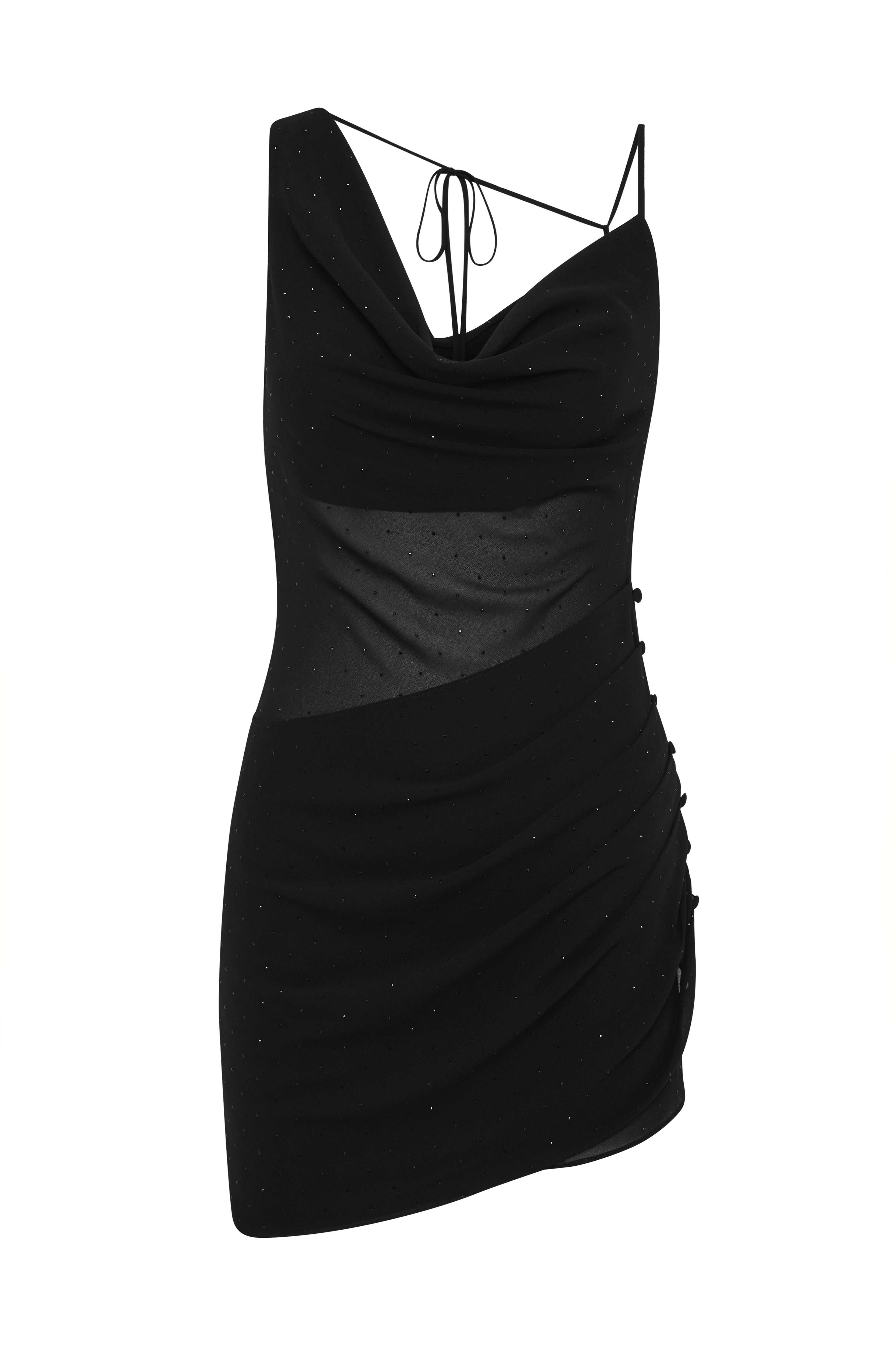 The Sydney Mini Dress features asymmetrical straps and hem, adorned with delicate black rhinestones for a subtle, all-over sparkle. Cut on the bias to softly contour the body, it drapes effortlessly while holding its shape. An overlay panel with tuck detailing and rouleau button closure on one side adds texture and dimension.